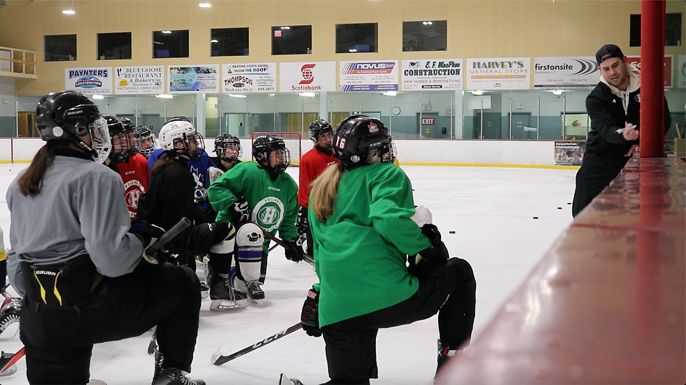 Brody Irving instructs a drill to Holland Hurricanes women's hockey players at a practice in Crapaud, P.E.I. prior to the team's home-opening weekend doubleheader.